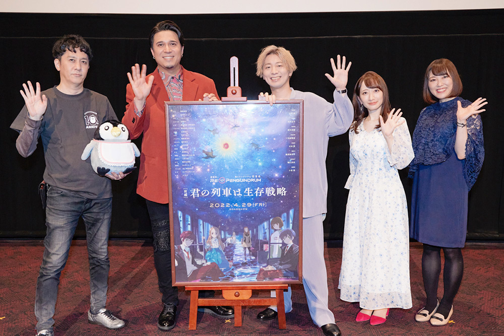 舞台挨拶のステージに並ぶのは、「ペンギン1号・2号・3号」の等身大フィギュア。このフィギュア制作も、クラウドファンディングの支援によってできたことのひとつだ。加えてエスメラルダとプリンチュペンギンの制作予定も発表したところで、シークレットとされていたゲストが明かされた。高倉冠葉役の木村 昴さん、高倉晶馬役の木村良平さん、高倉陽毬役の荒川美穂さん、荻野目苹果役の三宅麻里恵さん、4人のメインキャスト集合が明かされると、会場は興奮の雰囲気に包まれた。