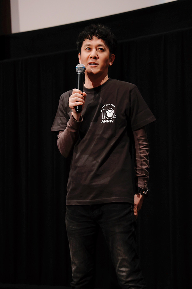 幾原監督は、10周年を記念したTシャツを着て、劇場版の新キャラクター「プリンチュペンギン」を手に、緊張した面持ち。本作の制作について「劇場版の制作について企画が生まれたときは、TVシリーズのフィルムをつないだイベント上映的なものになると思っていた。クラウドファンディングで予想を上回る支援をいただいたおかげで、やれることの幅がかなり広がって、『映画』にできるなと思いました」と感謝した。